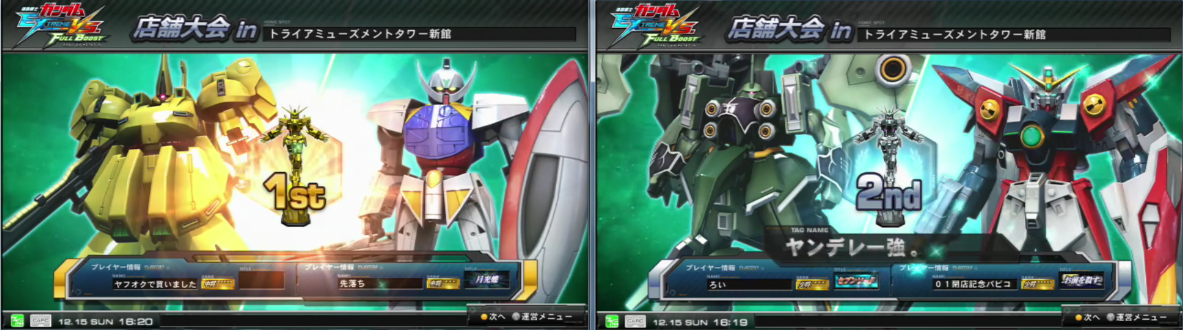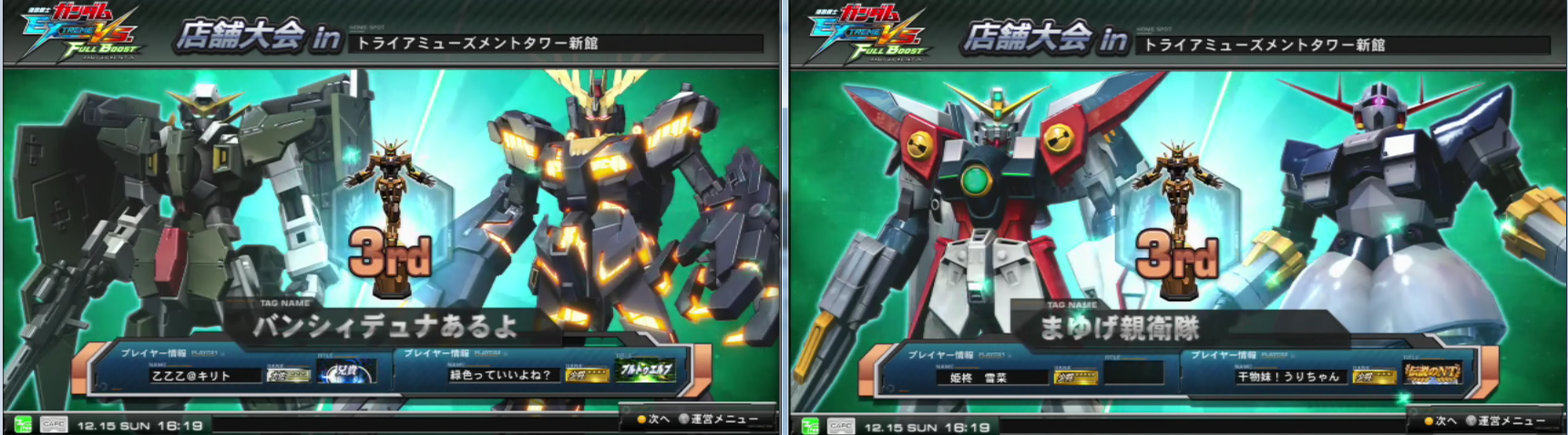 本日行われた『ガンダムエクストリームバーサスフルブースト』大会の結果を発表致します。