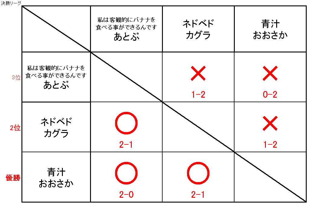 決勝戦は2本先取制の巴戦、もしくは2本先取制のシングルエリミネーショントーナメントで行います。