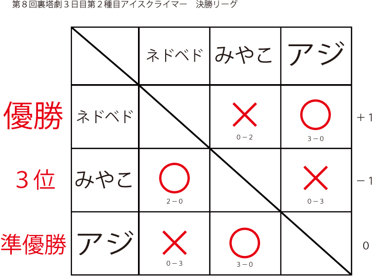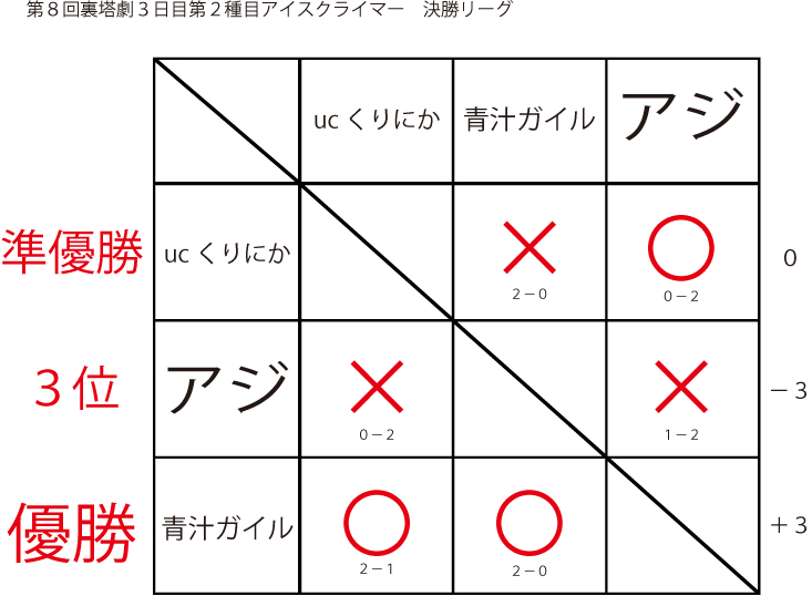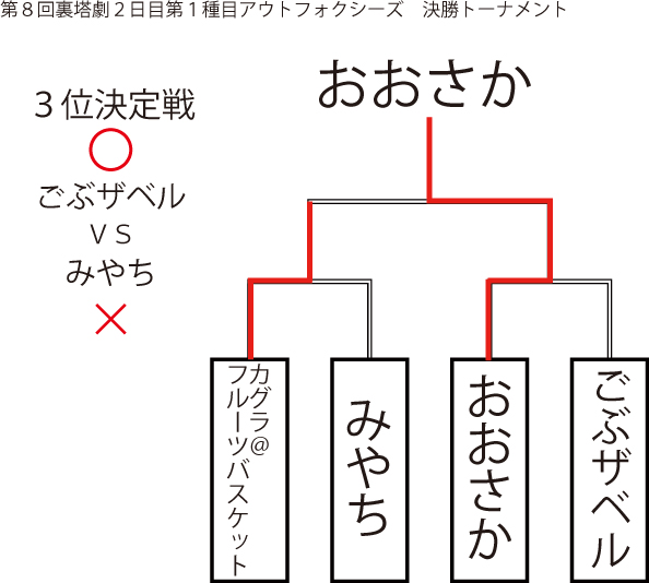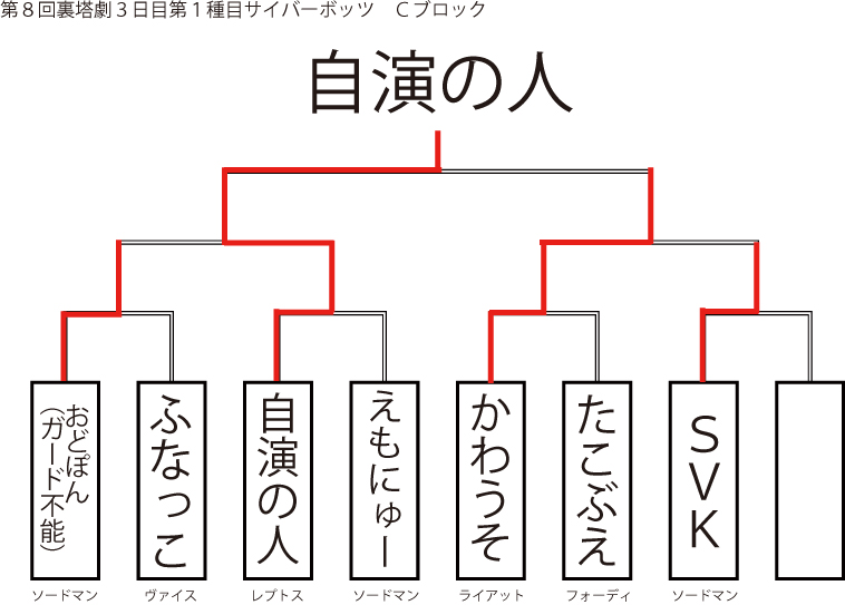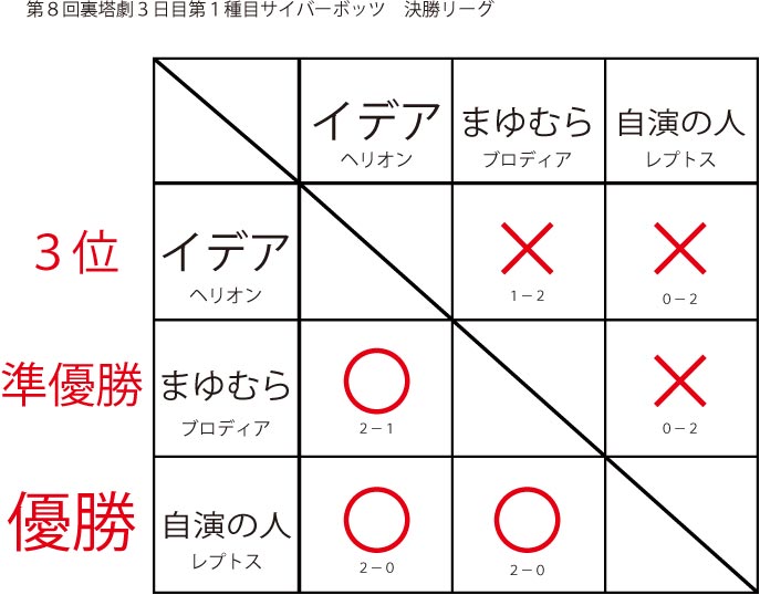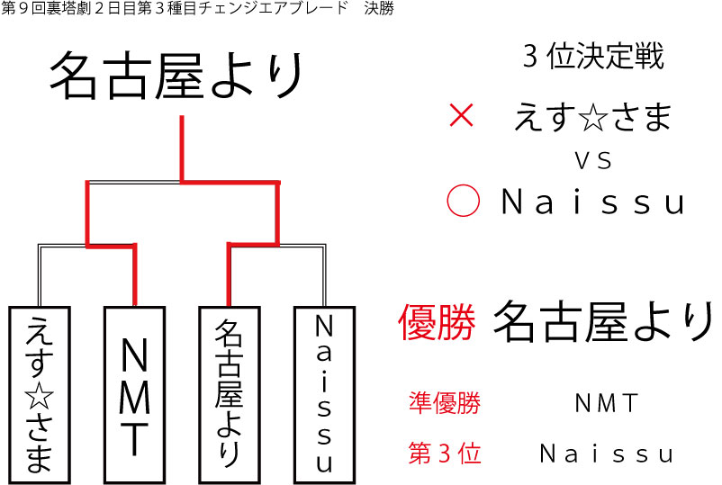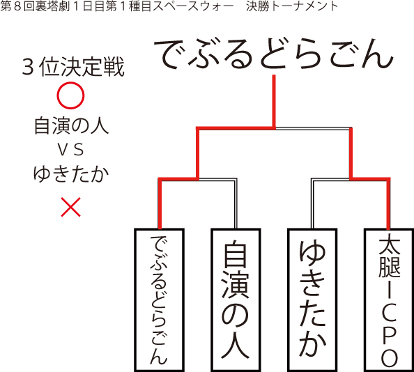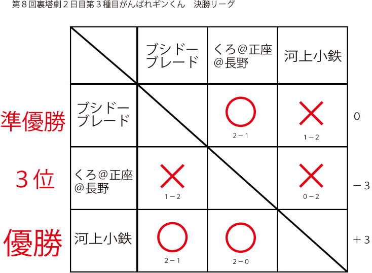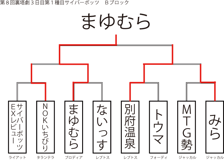 遅ればせながら先日当店にて行われました「第8回裏塔劇」の各種目上位入賞者及びトーナメントを発表いたします!!