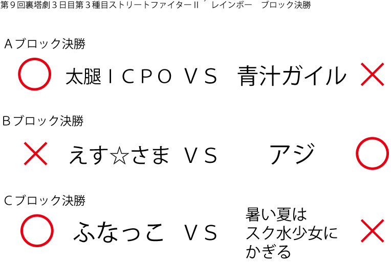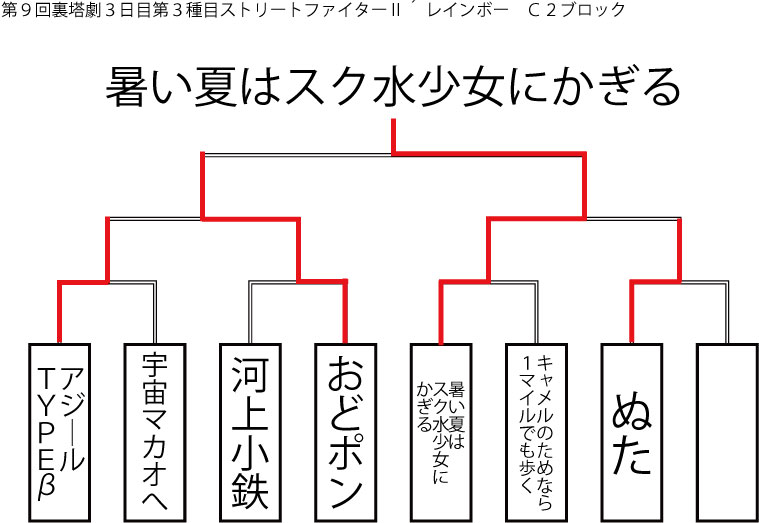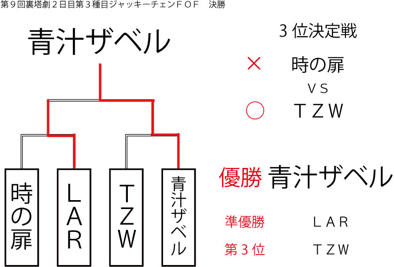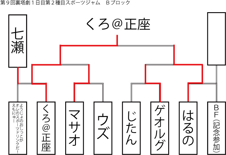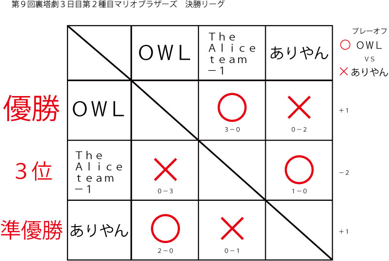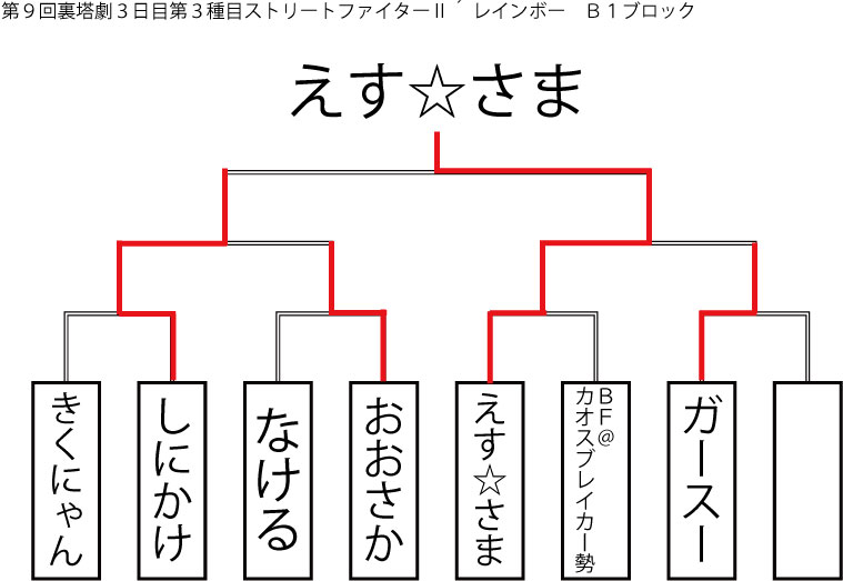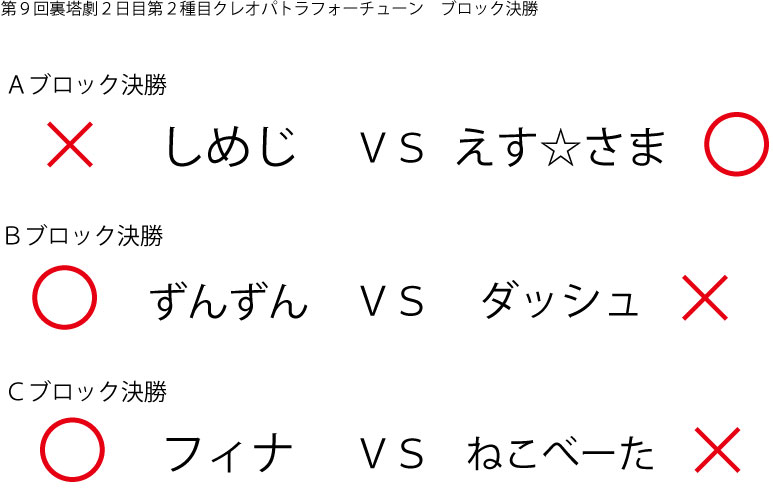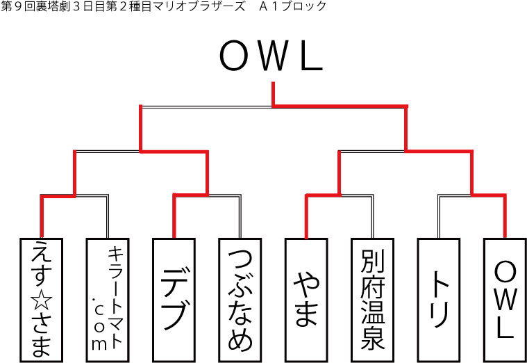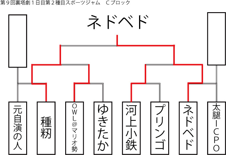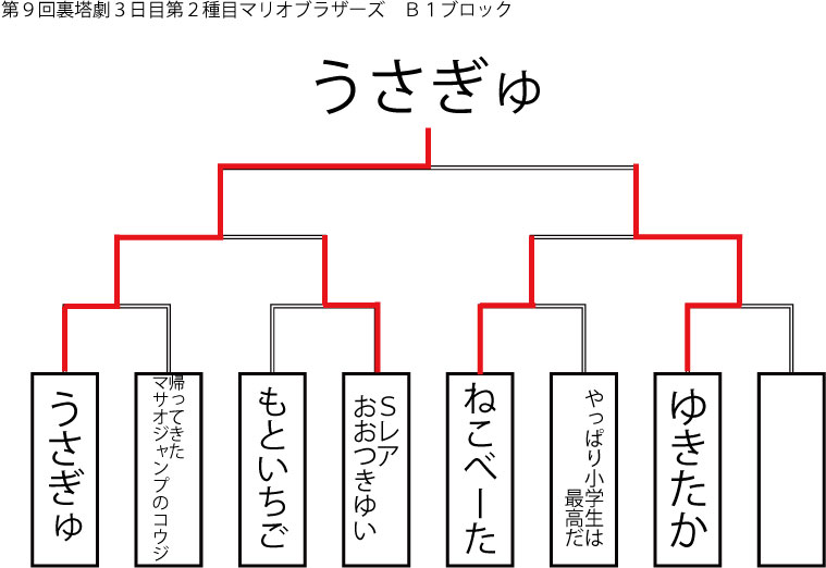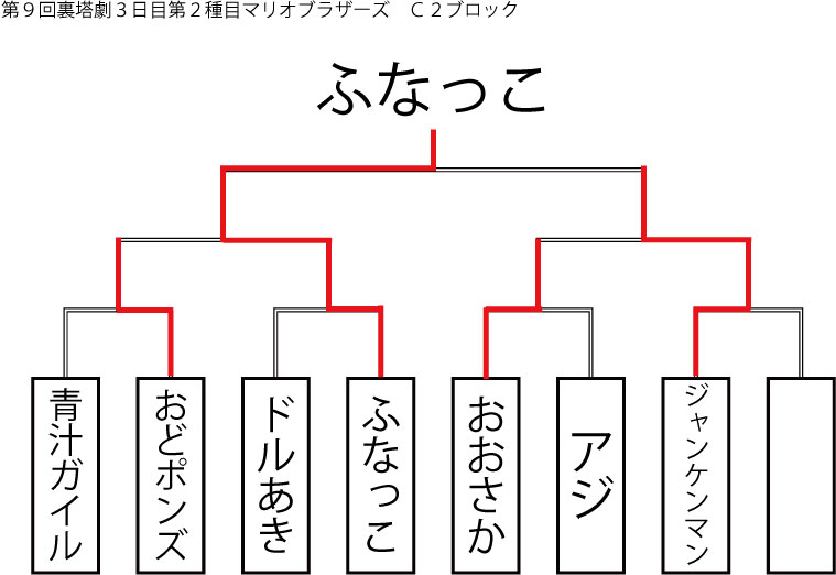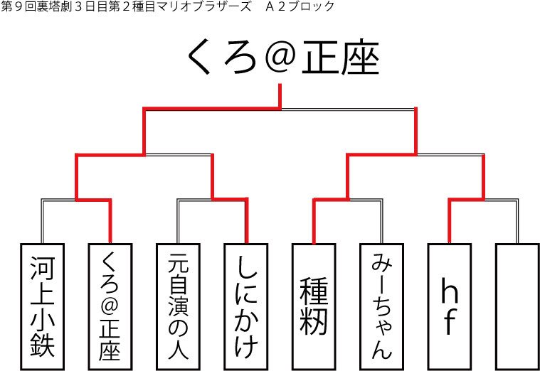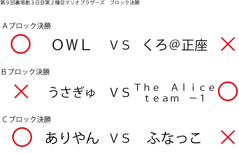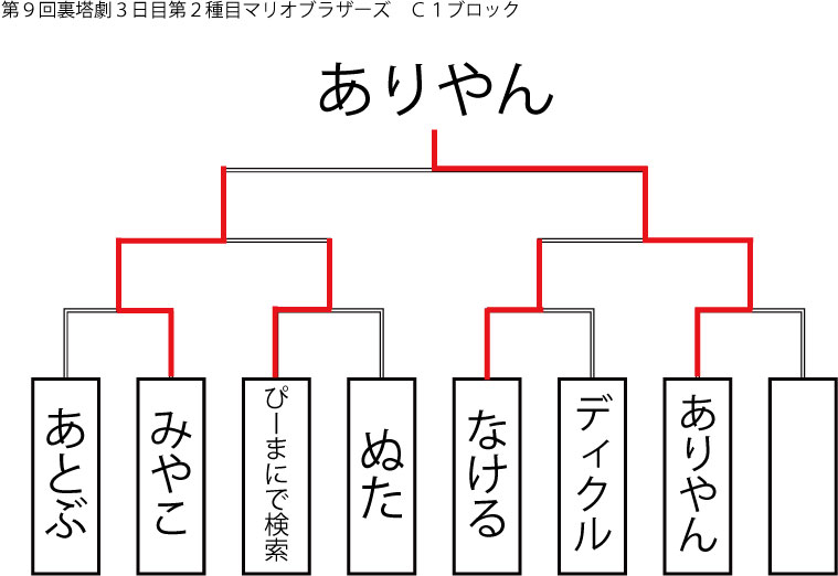 今大会も新種目は元より、常連種目に関してもマンネリを感じさせない試合の連続で新鮮味溢れる大会内容でした。個人的にはマリオブラザーズの無限1UPの原型としてあまりにも有名な(?)とある新即死ムーブを目の当たりに出来たのがかなり・・・。果たしてその内容は如何なる物か?それは動画で確認しましょう!(例の如くニコニコ動画にて今大会の動画をアップ中、キーワード「第9回裏塔劇」で検索して下さい。)